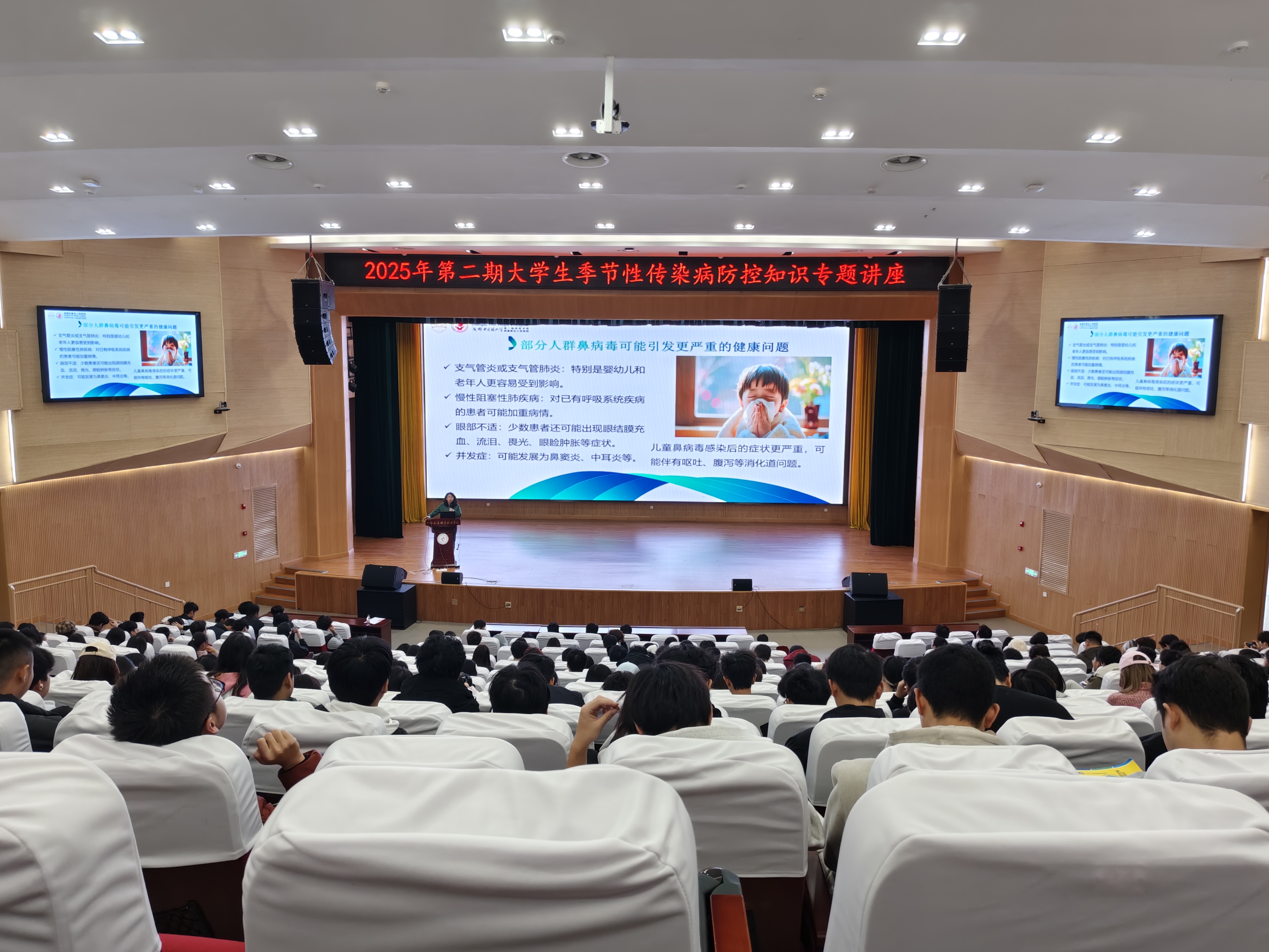 为扎实推进秋冬季校园传染病防控工作,11月13日下午,2025年第二期大学生季节性传染病防控知识专题讲座在厚学楼学术报告厅如期举行。本次讲座以“秋冬季传染病防治”为题,邀请成都市第五人民医院感染管理部(公共卫生科)部长杨娇为各系辅导员、学生代表及卫生所医护人员共计430余人进行传染病防控知识宣讲。